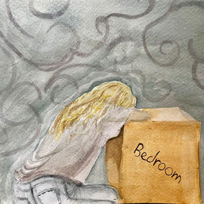 “This painting shows the pressure and exhaustion that comes with moving. It’s not just taking things from place to another, it’s saying goodbye to old friends and the places that you were able to call home. It’s about the mental preparation that comes with realizing that you have to start all over. You have to find a new coffee shop for the weekends, a new layout for your house, a new friend group, a completely new life. The painting is meant to capture the moment of rest in a time of stress and uncertainty.”
